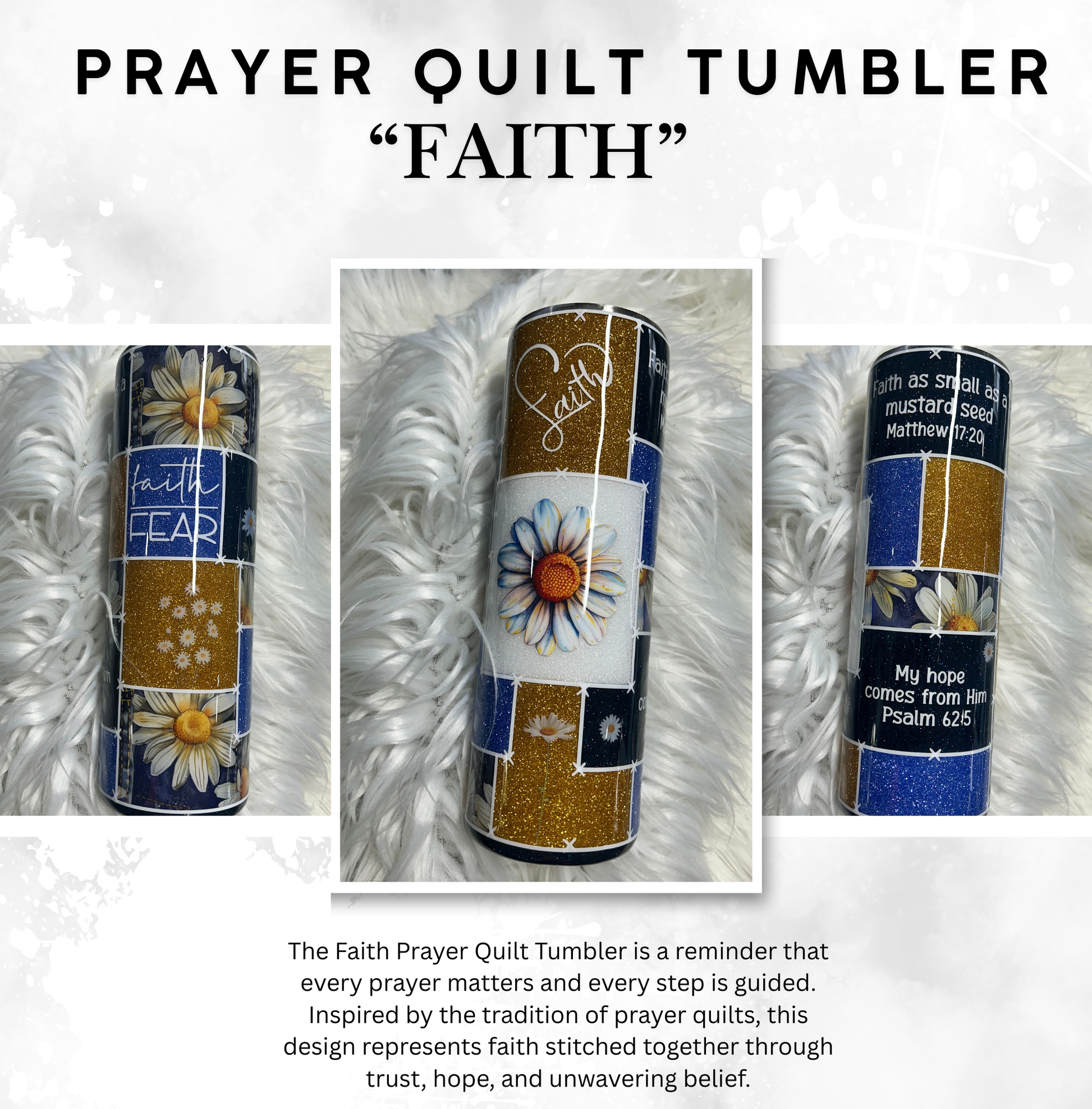 The Faith Prayer Quilt Tumbler is a reminder that every prayer matters and every step is guided. Inspired by the tradition of prayer quilts, this design represents faith stitched together through trust, hope, and unwavering belief.